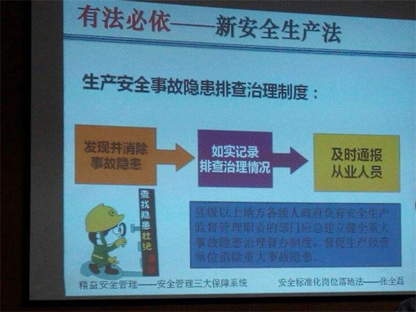 本次培訓(xùn)由著名的安全管理咨詢師張全磊老師主講,培訓(xùn)從安全第一(強(qiáng)化安全意識(shí)杜絕習(xí)慣違章)、預(yù)防為主(做好危害辨析消除現(xiàn)場(chǎng)隱患)、綜合治理(落實(shí)安全標(biāo)準(zhǔn)化安全管理體系化)三大方面展開(kāi)。