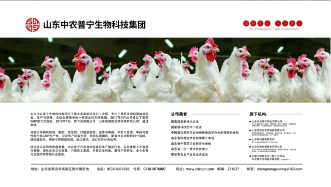 隨著政府對(duì)動(dòng)物源性食品安全問題的極大關(guān)注以及民眾對(duì)食品安全重要性認(rèn)識(shí)的不斷提高,中獸醫(yī)藥必將在畜禽綠色健康養(yǎng)殖中發(fā)揮出更大的作用,為此,作為以致力于動(dòng)物健康與食品安全為發(fā)展宗旨的中農(nóng)普寧生物科技集團(tuán),通過中獸醫(yī)專家的潛心研發(fā)經(jīng)過多年臨床實(shí)踐,結(jié)合國內(nèi)肉雞養(yǎng)殖特點(diǎn),隆重推出了安爾康、安若素、倍爾爽等中藥產(chǎn)品,為養(yǎng)殖業(yè)保駕護(hù)航。